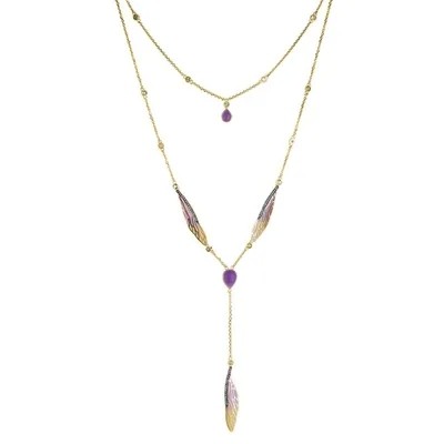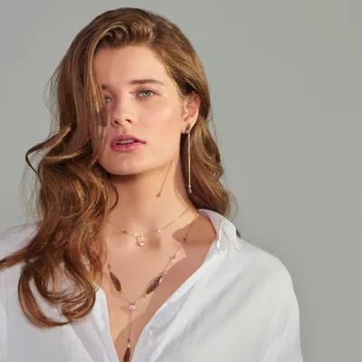الرمز الرئيسي لمجموعة Libelle - dragonfly وأجنحته ، باعتباره انعكاسًا للأنوثة الأبدية ، والحب ، والسعادة والجمال ، وكذلك النمط الفريد من نوع الفن والكتفين ، يلمعون بهدوء على عظام الترقوة. تسقط قطرات الحجارة في العطلة الهشة للحلق وتدفق لأسفل إلى خط العنق ، لفت الانتباه إلى جمالها.
